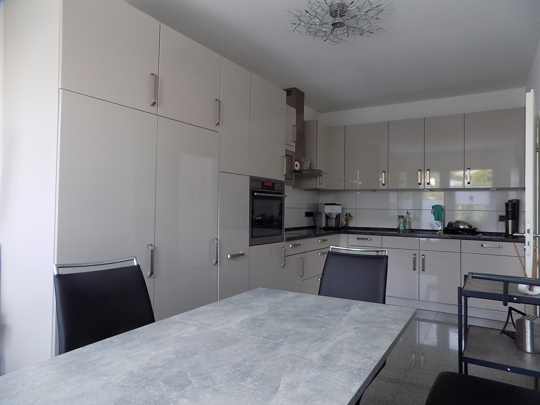 Die Wohnung verfügt über eine großzügige Einbauküche mit hochwertigen Elektrogeräten. Eine integrierte Essecke sowie ein Fernsehanschluss runden den Küchenbereich komfortabel ab. Der hochwertige Granitboden verleiht den Räumen ein elegantes, pflegeleichtes Ambiente.